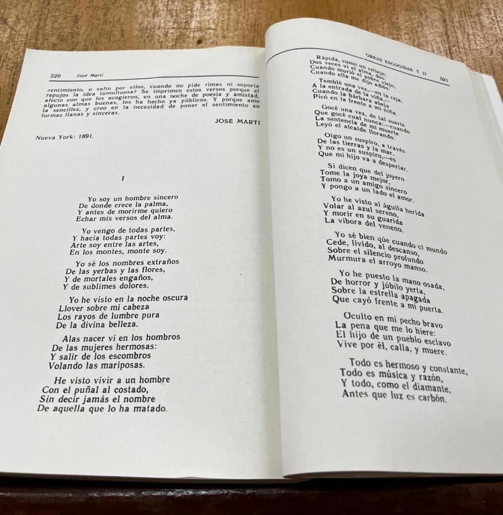 José Martí is one of the most prominent figures in Cuban history. Born in 1853, he was a politician, founder of the Cuban Revolutionary Party, and leader of the Cuban Independence War. In addition, he was a prolific writer, poet, and journalist, leaving many of his thoughts on politics, society, and other matters on paper. I could easily realise the vast extent of his work, as the complete collection of his writings spans more than thirty huge volumes. I opted to dive into his Selected Works for some time, gathered in more than a thousand pages of essays, articles, and poems. I particularly enjoyed his poetry — original and passionate, delving into profound themes through unexpected sources of inspiration (I found a poem dedicated to Chianti wine that was endearing to read). As he defines it in the prologue to his Versos Libres: “These are my verses. They are what they are. I didn’t borrow them from anyone.”