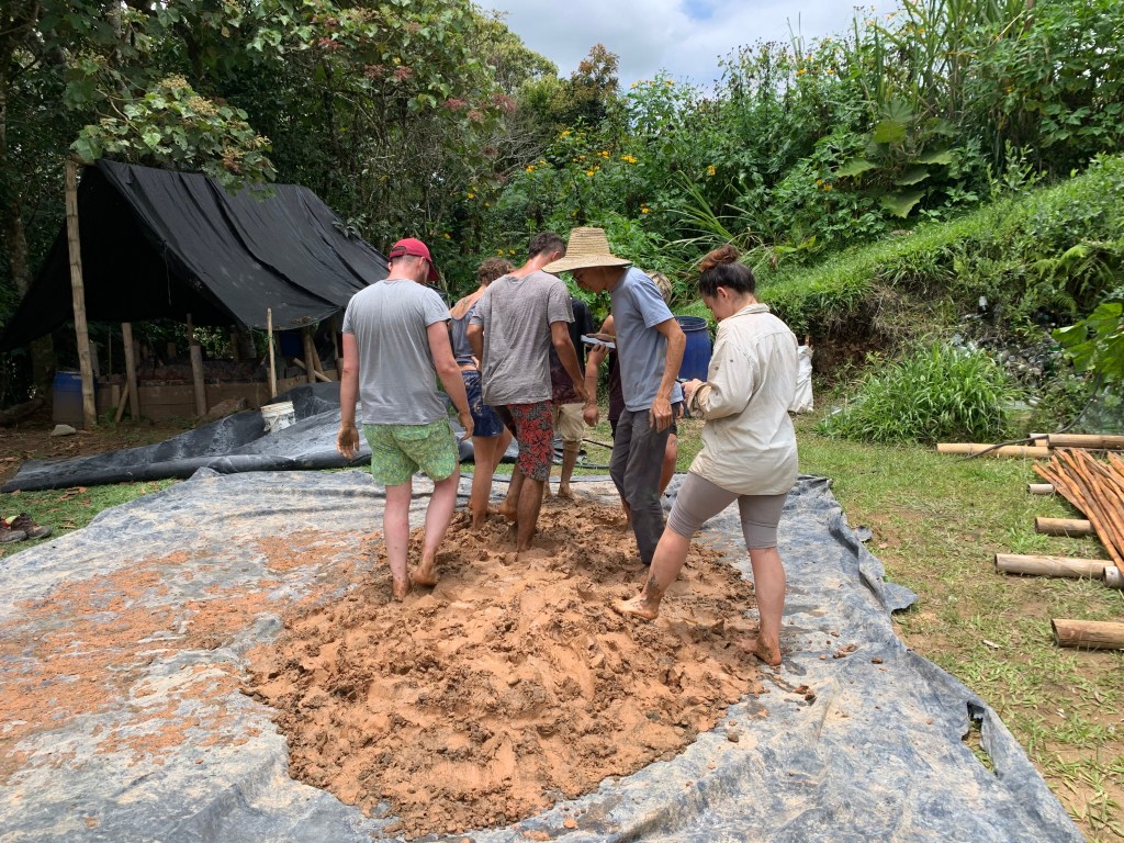 I helped with many different activities during my stay at Tierrita Linda—cutting and polishing guaduas, placing them in a pool to be naturally “immunised”, removing weeds in the garden, making compost, reorganising materials, and extending the walls of a structure—but the experience that impressed me most was preparing the clay mixture (mezcla) used to fill and cover walls.